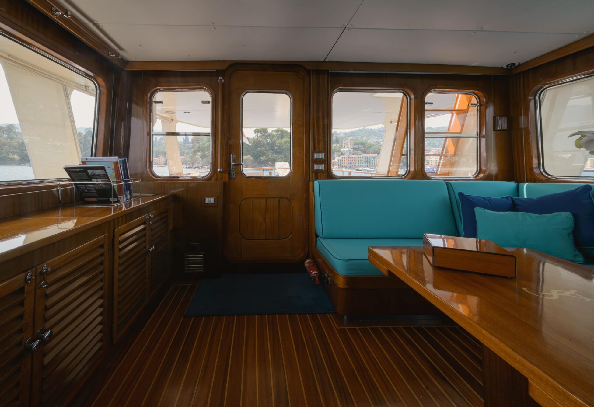 まず何より、本艇がまとったクラシックならではの気品が心を捉える。船首から船尾へと伸びる船体のやわらかな“ひとつながりの曲線”は、時代を超えて受け継がれてきた職人の美意識を感じさせる。今日主流となったFRP素材以前に丁寧に仕上げられた木部のトリムや、控えめながら均整の取れたブリッジの造形は、熟練した職人技が光る部分であり、その佇まいをいっそう引き立てている。半世紀という年月がもたらした落ち着きは、乗る者にやさしい安堵と静かな高揚を与えてくれる。